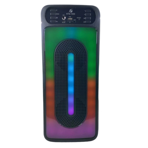 ناموجوداسپیکر بلوتوثی کی تی اس مدل KTS-1762، منبع انرژی باتری و برق، همراه با کابل شارژ، میکروفون بیسیم و ریموت کنترل، درگاه ارتباطی شامل جک 3.5 میلیمتری خروجی صدا، USB و AUX، دارای رقص نور، پنل شیشهای، قابلیت TWS
