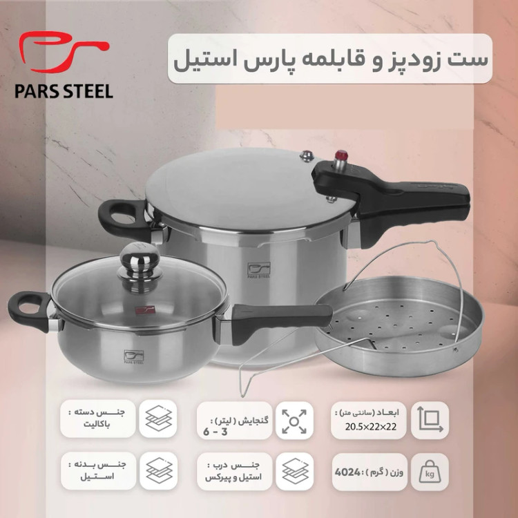 زودپز دوقلو پارس استیل مدل کف سه لایه گنجایش 6 و 3 لیتر+سبد بخارپز+درب پیرکس