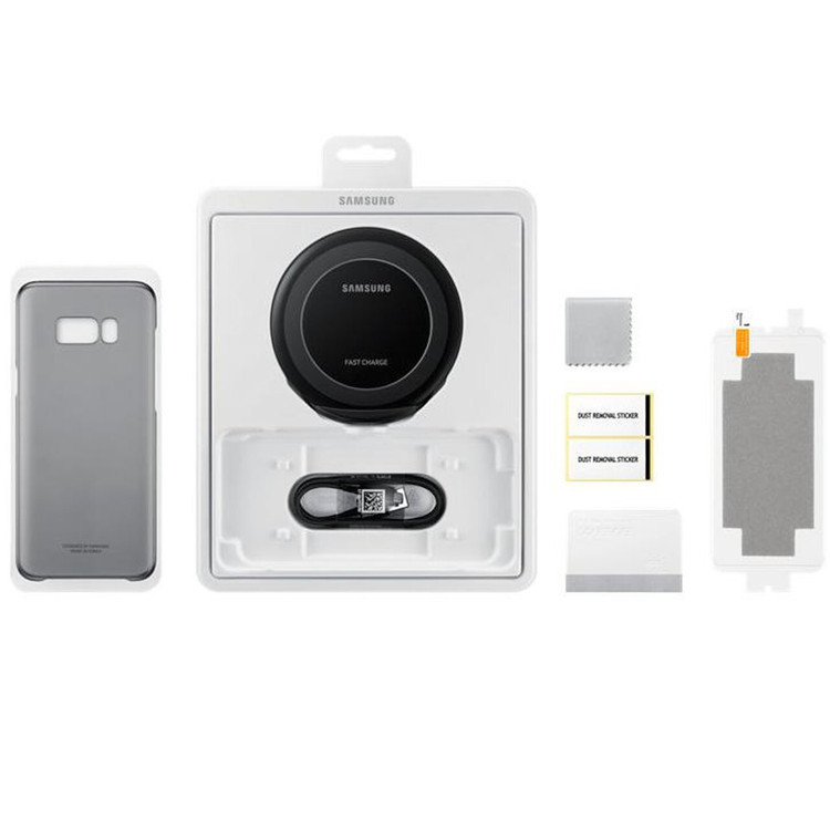 در این مجموعه، یک شارژر بیسیم سامسونگ و یک کاور و دو برچسب صفحه برای گوشی موبایل سامسونگ گلکسی S8 Plus وجود دارد. تکنولوژی شارژ بیسیم یا همان استاندارد Qi از مدتها پیش، در برخی محصولات الکترونیکی مانند گوشیهای موبایل به کار گرفته شده است. این تکنولوژی همانطور که از نامش پیداست، امکان شارژ باتری محصولات الکترونیکی دارای این استاندارد را بهصورت بیسیم فراهم میکند. شارژر بیسیم مدل «EP-WG95F» یکی از سری محصولات شرکت «سامسونگ» است که از دو قابلیت شارژ سریع و بیسیم بهطور همزمان پشتیبانی میکند. البته ویژگی شارژ سریع در این محصول تنها با گوشیهای پرچمدار سامسونگ مانند گلکسی S7.8.9.9 PLUS.8 PLUS، گلکسی نوت 5، گلکسی S7 Edge و دستگاههایی از این قبیل سازگاری دارد. بنابراین دیگر محصولات تنها میتوانند از ویژگی شارژ بیسیم این شارژر استفاده کنند. قابلیت شارژ سریع در این دستگاه از صفر تا صد درصد باتری گوشیها را در مدتزمان 50 دقیقه کمتر از نمونهی معمولی، بهطور کامل شارژ میکند. گوشیهای پرچمدار سامسونگ بدون هیچ کیت اضافهای با این دستگاه همگام شده و باتری آنها شارژ میشود؛ اما گوشیهایی مانند سامسونگ گلکسی S5، نوت 3، S4، نوت 4 و گلکسی نوت اج برای استفاده از این محصول به یک کیت شارژ نیاز دارند. سامسونگ این دستگاه را با ظاهری شبیه به دایره، ضخامت 25 میلیمتر، قطر 100 میلیمتر و وزن 116 گرم طراحی و تولید کرده است. روی سطح این محصول، یک نوار با لایهای از پلاستیک ضدلغزش وجود دارد که مانع از سرخوردن و افتادن گوشی در هنگام شارژ میشود. یک نشانگر LED هم روی سطح این شارژر قرار گرفته است که وضعیت شارژ باتری را نمایش میدهد. درگاه خروجی شارژ در این دستگاه، بیسیم (Wireless) و درگاه ورودی آن ـ که به آداپتور دیواری سامسونگ متصل میشود ـ microUSB است. شدتجریان ورودی در این شارژر 2 آمپر و شدتجریان خروجی آن 1.67 آمپر است. سامسونگ ولتاژ ورودی این محصول را 5 و ولتاژ خروجی آن را 9 ولت اعلام کرده است. گفتنی است تمام گوشیهای هوشمند و لوازم الکترونیکی بهرهمند از استاندارد Qi، قابلیت شارژشدن بیسیم و استفاده از این شارژر را دارند. کاور شیشه ای موجود در این مجموعه هم برای گوشی موبایل سامسونگ گلکسی S8 پلاس مناسب است. زمان استفاده از این کاور، قاب پشتی و لبهها دستگاه شما در برابر خطوخش و ضربههای نهچندان شدید محافظت میشوند. ابعاد، شکل ظاهری و محل قرارگیری دوربین، کلیدها، درگاهها و اسپیکر در این محصول براساس گوشی موبایل شما اندازهگیری شده و برش خورده است. هیچ پوششی روی کلیدها و درگاهها نیست؛ بنابراین برای استفاده از آنها هیچگونه مانعی وجود ندارد و دسترسی آسان خواهد بود.