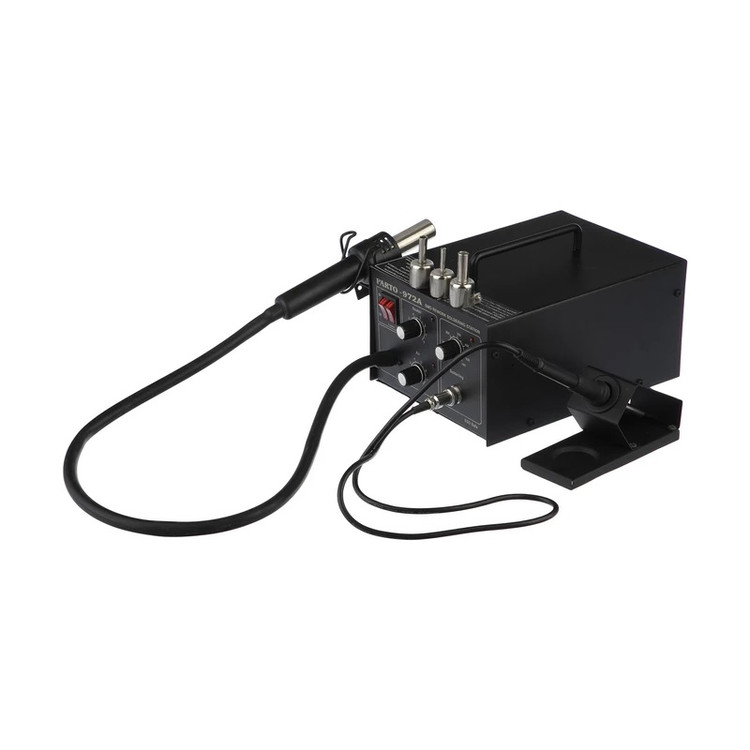 محصول فوق یک دستگاه چندمنظوره بوده که میتوانید از آن برای اتصال و جداسازی قطعات الکترونیکی و به خصوص قطعات SMD استفاده کنید. این محصول متشکل از یک هیتر و یک هویه است که شرکت صنعت پرتو آندیا آن را تحت عنوان مدل PARTO 972A تولید میکند. از این هویه و هیتر میتوانید به صورت همزمان یا مجزا استفاده کنید. قابلیت تنظیم دمای هویه در بازه 150 تا 500 درجهی سانتیگراد کمک میکند تا در هنگام لحیمکاری روی سطوح و مواد مختلف، مشکلی نداشته باشید. هیتر این ابزار با کمک هوای خروجی، سطح مورد نظر را گرم میکند و با کمک کلیدهایی که در نظر گرفته شده؛ قادر خواهید بود تا دمای هوای خروجی و شدت آن را در 7 مرحله تنظیم کنید. از آنجایی که بخش هیتر و هویه در حین استفاده دمای بالایی خواهند داشت، از پایههایی ویژه برای قرار دادن آنها استفاده شده است. شرکت تولیدکننده برای این محصول، 3 نازل هیتر در سایزهای مختلف درنظر گرفته تا بتوانید با دقت بیشتری سطح مورد نطر را گرم کنید.