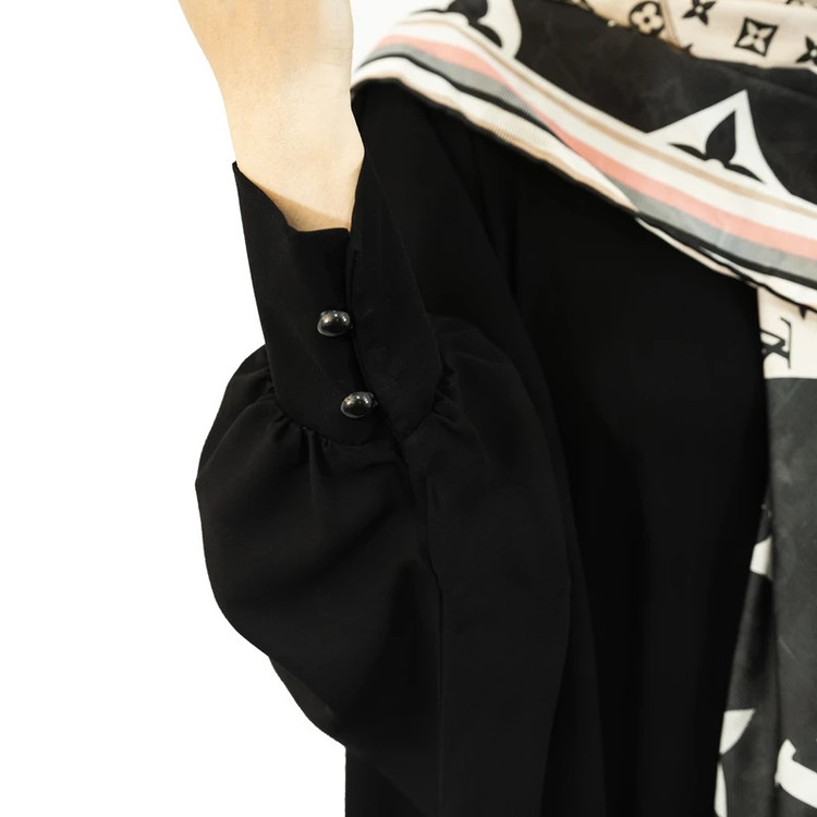 جنس پارچه این عبا حریرالاسوده که بسیار مشکی و سبک هست ، به صورت فری سایز طراحی شده که مناسب سایز 38 تا 50 می باشد . عبا به صورت جلو بسته و دارای یقه گرد است که پشت یقه زیپ می خوره. قد عبا 139 و قدآستین از کنار گردن 75 است . مچ عبا دکمه دار است .