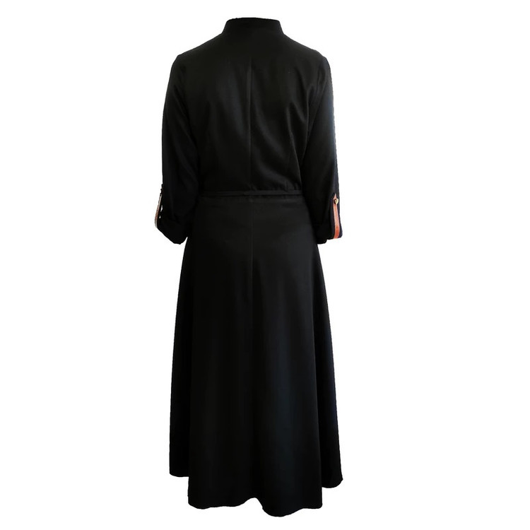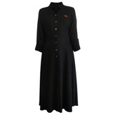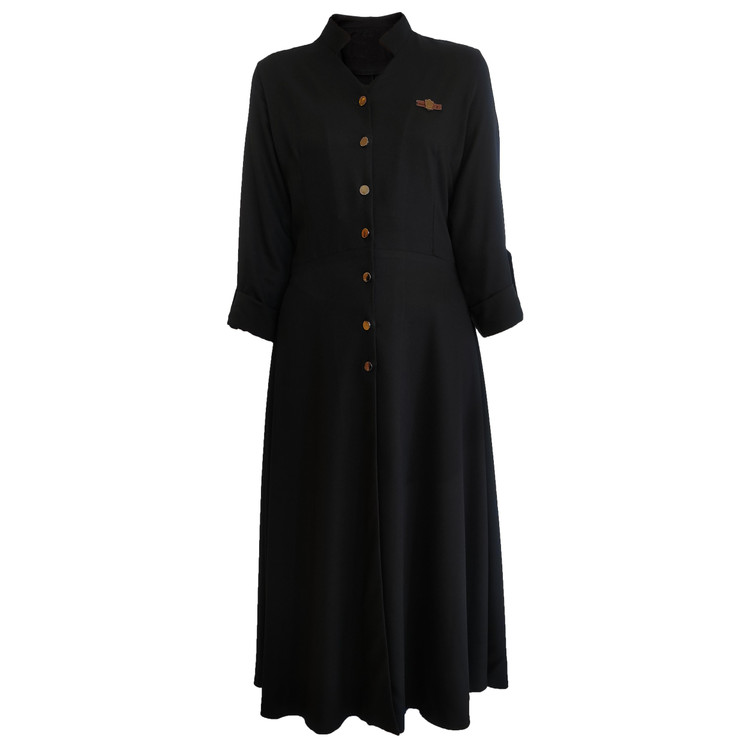 مانتو طرح کلوش به رنگ مشکی میباشد.آستین مانتو در دوحالت باز و نیمه باز قابل استفاده است.در عکسی که مشاهده میکنید آستین مانتو در حالت نیمه باز قرار دارد که در صورت باز کردن دکمه آستین کاملا باز و بلند میشود و تا مچ دست می اید.پارچه دارای طرح بسیار ریز است که در عکس مشخص میباشدو مانتو مناسب فصل بهار و تابستان است.لطفا به جدول سایزبندی در عکس اخر توجه بفرمایید.