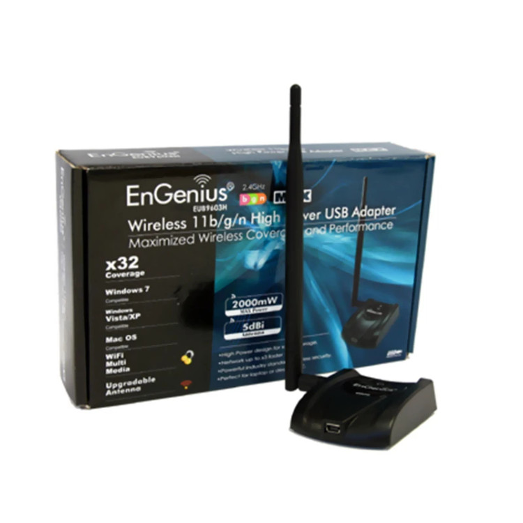 زمانی که احساس کردید به کارت شبکه ی قوی تری نیاز دارید فقط یک آنتن قوی تر روی آن ببندید تا منطقه ی بیشتری تحت پوشش قرار بگیرد، کارت شبکه EnGenius مدل EUB9603 می تواند انتخاب بسیار مناسبی برای شما باشد. کارت شبکه ی بی سیم Engenius 9603H با توان ۲ وات یا ۳۳dbm و با استاندارد 802.11bgn توانایی برقراری یک ارتباط پایدار و بدون قطعی و وصلی در شرایط سیگنال ضعیف و یا دور را دارد. در محیطهای بزرگ و وسیع بهترین گزینه برای کارت شبکه وایرلس جهت استفاده در لبتاپ یا pc میباشد.