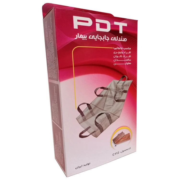 صندلی جابجایی بیمار PDT ایده آل برای جابجایی بیمار و مصدوم در مکان هایی است که امکان عبور ولیچر در آنجا وجود ندارد مثل راه پله ، سطوح نا هموار و... است. از این صندلی میتوان برای جابجایی بیمار از ویلچر به روی تخت یا صندلی خودرو استفاده کرد به گونه ای که با طراحی ارگونومیک و اصولی بر اساس ساختار بدنی بیمار و جابجا کنندگان ، فشاری بر ستون مهره ها و گردن بیمار و جابجا کنندگان وارد نمیشود . با توجه به 6 عدد دستگیره تعبیه شده ، به 2 الی 6 نفر این امکان را میدهد تا حمل بیمار را به اشتراک گذاشته و وزن بیمار بین افراد تقسیم میگردد که خطر آسیب دیدگی را کاهش میدهد. پارچه استفاده شده از نوعی پارچه بسیار مقاوم است که تحمل بالایی در برابر کش آمدن و پاره شدن دارد ، به گونه ای که اگر نیروی بسیار زیادی به آن وارد شود آنقدر کش میاید که نازک شود و هیچگاه به طور ناگهانی پاره نمیشود با بکارگیری تسمه های برزنتی مقاوم در بدنه صندلی و طرفین ، بدن مصدوم توسط آن محصور میشود که ترکیب تسمه ها و پارچه مقاوم این امکان را میدهد که تا 120کیلوگرم تحمل وزن داشته باشد . صندلی جابجایی بیمار به هنگام تاشدن و بسته بندی به اندازه یک بطری آب است و وزن آن 290 گرم که حجم و وزن سبک آن ، این امکان را میدهد که بتوان آن را داخل کیف کمک های اولیه و یا کوله پشتی کوه نوردی قرار داد تا در هنگام کوهنوردی و طبیعتگردی که احتمال وقوع حوادثی از قبیل پیچ خوردگی پا ، ارتفاع زدگی و حالت تهوع و دیگر مصدومیت ها وجود دارد که در این شرایط امکان همراه داشتن برانکارد و ویلچر نیست ، مانند یک معجزه برای تیم عمل میکند و جان مصدوم را نجات میدهد . 4 دسته در طرفین و 2 دسته در بالا و پایین این توانایی را به افراد جابجا کننده میدهد تا بجای اینکه از دستگیره های بغل بیمار جابجا شوند از جلو و عقب بیمار جابجا شوند که باعث میشود از پهنای به اندازه 3 نفر به پهنای 1 نفر کاهش پیدا کنند که کمک میکند در راهروهای تنگ و مسیر های باریک به راحتی عبور کنند. با آب ولرم (مایل به خنک) شسته شود . از چلاندن آن جلوگیری شود . از اتو زدن آن جلوگیری شود. شستن با ماشین لباسشویی مشکلی ندارد. محدودیتی در دفعات استفاده آن وجود ندارد