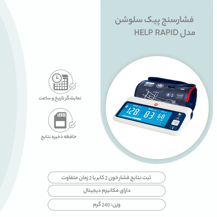 فشارسنج بازویی دیجیتال برند پیک سلوشن مدل help RAPID، با قابلیت نمایش میانگین نتایج، تشخیص آریتمی، هشدار خطای محاسباتی و خاموش شدن خودکار، دارای نمایشگر LCD، به همراه کیف، 4 عدد باتری نیم قلمی، CD آموزش