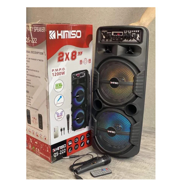 اسپیکر کیمیسو مدل QS-222 برای تولید صدای شفاف در محیط هایی که به صداهای مختلف نیاز است طراحی شده و به زبان ساده هر نوع صدایی که میتوان به صورت با کیفیت در محیط شنید را برای شما تولید میکند. اسپیکر بیسیم QS-222 از سری اسپیکرهای تولید شده توسط کمپانی کیمیسو است که به عنوان اسپیکر بی سیم روانه بازار شده است. این اسپیکر دارای قابلیت اتصال میکروفون است که با استفاده از این قابلیت میتوانید در میکروفون خود بخوانید و صدای خود را از این اسپیکر بشنوید.این اسپیکر بیسیم دارای باتری لیتیوم یونی قابل شارژ است. با استفاده از این باتریهای قابل شارژ میتوانید این اسپیکر را در هر زمان به هر مکان که مایل هستید به همراه خود ببرید و به موسیقیهای مورد علاقه خود گوش دهید. همچنین با هربار شارژ این اسپیکر نیز میتوانید تا ساعتها از پخش موسیقی لذت ببرید. اسپیکر QS-7801 دارای ورودی میکروفون است. با استفاده از این ورودی میکروفون میتوانید میکروفون خود را به این دستگاه متصل کنید و با استفاده از قابلیت کارائوکه به صورت یک اجرای زنده صدای خود را از اسپیکر بشنوید. همچنین میتوانید یک موسیقی بیکلام پخش کنید و روی آن بخوانید. اتصال به این اسپیکر به دو صورت باسیم و بیسیم امکانپذیر میباشد. اتصال بیسیم از طریق بلوتوث و اتصال باسیم از طریق AUX، USB، Line و Micro SD Card صورت میگیرد. بنابراین با هرکدام از روشهای اتصال، میتوانید به این اسپیکر متصل شوید و موسیقیهای مورد علاقه خود را پخش کنید. بر روی قسمت بالایی این اسپیکر، تعدادی دکمه و کنترلکنندههای چرخشی قرار گرفته است. با استفاده از این پنل کنترلکننده، میتوانید به کنترل مقدار صدا و همچنین میتوانید با استفاده از دکمههای تعبیه شده بر روی این پنل، پخش موسیقیهای خود را نیز در کنترل خود قرار دهید. در قسمت بالایی پنل کنترلکنندهی این اسپیکر، یک صفحه نمایش دیجیتال قرار گرفته است. همچنین این اسپیکر قابلیت اتصال همزمان با اسپیکر مشابه را دارد. و با 70 درصد میزان صدا تا 4 ساعت میتوانید از موسیقی لذت ببرید.