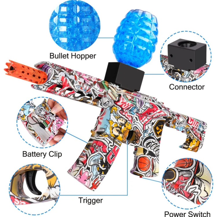 تفنگ مهمات ژله ای که با باتری قابل شارژ کار می کند. تا 200 گلوله را در یک زمان با برد بیشتر از 15 متر بارگیری می کند. از مهمات ژله ای 8 میلی متری A-001 استفاده می کند. مهمات ژله ای لک نمی کند و بعد از شلیک تبخیر می شود.شامل تفنگ، خشاب قابل جابجایی ، باتری قابل شارژ، شارژر USB، ظرف با مهمات 300 عددی ساشه 2000 گلوله c/u دارای مهمات برای هیدراته کردن، بند تفنگ و عینک ایمنی. بسیار مهیج، حتی برای افردا بزرگسال.