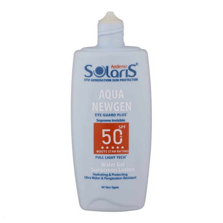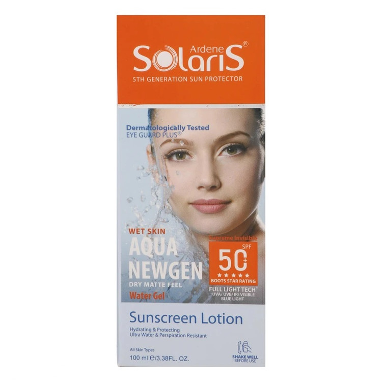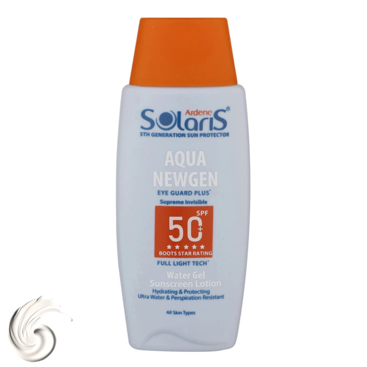 لوسیون ضد آفتاب بدون رنگ آردن سولاریس SPF50 مدل AQUA NEWGEN محافظ UVA ،UVB، ضد آب، مناسب انواع پوست حجم 100 میلیلیتر