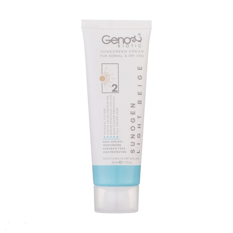 کرم ضد آفتاب مخصوص پوست های خشک و معمولی ژنوبایوتیک، با دارا بودن فیلترهای UV و همچنین مواد موثره گیاهی، نقش موثری در مهار اثرات مضر پرتوهای UVA و UVB دارد. بافت این کرم برای پوست های خشک و معمولی طراحی شده، که علاوه بر ایجاد پوشش کامل بر روی پوست، به حفظ رطوبت و تازگی پوست کمک نموده و با دارا بودن بافت سبک، مانع از پیری زودرس و ایجاد چین و چروک پوستی می شود.