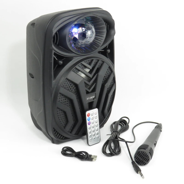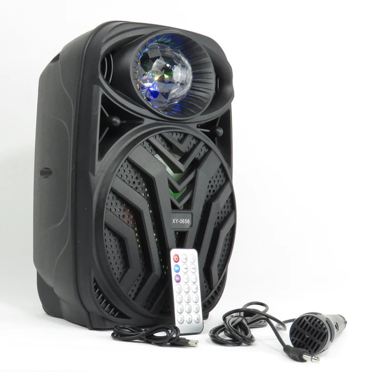 اسپیکر بلوتوثی قابل حمل رقص نوری XY0656 با بدنه ای از جنس پلاستیک فشرده ساخته شده و دارای میکروفون به همراه کابل میکروفون و ریموت کنترل است. وجود یک عدسی لاکی در قسمت بالایی این دستگاه به خوبی رقص نور را پراکنده میکند و در فضای تاریک و یا کم نور جلوه بسیار زیبایی دارد.ضمن اینکه نور LED روی باند این اسپیکر متصل است و رقص نور میکند. این اسپیکر یک پنل کنترل صدا و موزیک در پشت دستگاه دارد و دارای یک باند بزرگ 16سانتی متری یا6.5 اینچی است که به خوبی میتواند عمق صدا را برای شنونده فراهم کند.این اسپیکر قابلیت tws دارد و میتوانید با تهیه یک مدل دیگر آن هر دو را به یکدیگر متصل کرده و صدا را به صورت مجزا از دو کانال صدای راست و چپ دریافت کنید.این قابلیت به شما صدای کاملا استریو میدهد. همچنین دارای درگاه usb،رم و aux میباشد. اسپیکر XY0656 ارتفاع 31 سانتی متری دارد و عرض حدودا 17 سانیتمتر و طول آن حدودا 21 سانتیمتر است. صدای اسپیکر XY0656 و صدای میکروفون آن با پیج صدایی که روی آن قرار دارد تنظیم میشود. میکروفون این اسپیکر دارای کلید روشن خاموش است و در صورت استفاده نکردن میتوانید آن را خاموش کنید. از راههای دیگر کنترل صدا و تغییر موزیک، استفاده از ریموت آن است. اسپیکر XY0656 سه حالت دارد. میتوانید در حالت رادیو آن را قرار دهید که باید حتما کابل aux به آن متصل کنید تا فرکانسهای FM را به خوبی پخش کند در حالات بعدی رم و usb را هم میتوانید با فشردن دکمه M تغییر دهید. ضمن اینکه برای حمل راحت تر این اسپیکر دسته ای روی آن طراحی شده است که کاملا همجنس بدنه دستگاه است و بسیار برای جا به جایی خوش دست است. این اسپیکر حجم صدای بسیار قدرتمندی را تولید میکند و فرکانس قابل پخش این دستگاه 18 هزار هرتز است که به دلیل نزدیک بودن این فرنکانس به مرز 20 هزار هرتز که حداکثر محدوده شنوایی انسان است میتواند صدا را بسیار با کیفیت پخش کند و عملکرد خود را در هنگام دیدن فیلم سینمایی و گیماکشن به خوبی با تولید عمق بیس صدا به نمایش میگذارد. اسپیکر با داشتن حساسیت 80 دسیبل، ظرافت صدا را به خوبی به گوش شنونده میرساند. وسایل همراه این اسپیکر یک عدد میکروفون، یک عدد کابل میکروفون، کابل شارژ و یک ریموت کنترل است.