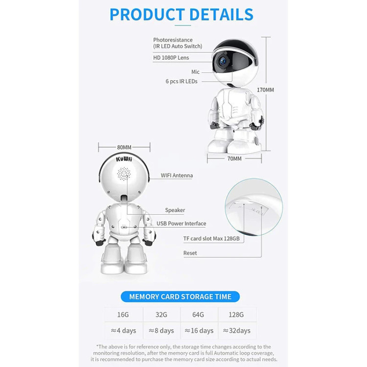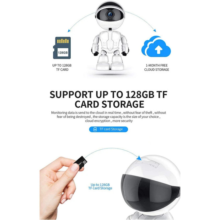 قسمت سر این ربات قابلیت چرخش 355 درجه به صورت Pan و Tilt دارد.همچنین دوربین وای فای هوشمند به طور خودکار هنگام حرکت شخص بدن را ردیابی می کند. (می توانید این عملکرد را در اپلیکیشن باز یا بسته کنید). در این دوربین هرگونه حرکت مشکوک که در محدوده دید چشم دوربین باشد، شناسایی و ضبط می شود و شما هشدارهای فوری اپلیکیشن را در دستگاه های هوشمند خود در هر کجا که هستید دریافت خواهید کرد. دوربین مدار بسته IP روبات، صوت دو طرفه را به شما ارائه می دهد. دوربین با میکروفون و بلندگو ساخته شده است. بنابراین می توانید هر زمان که می خواهید از طریق تلفن هوشمند خود با فرزندان خود از راه دور صحبت کنید. این دوربین کارت حافظه حداکثر 128 گیگابایت را پشتیبانی می کند، به این معنی که می توانید تصاویر و فیلم ها را برای مشاهده بعدی ذخیره کنید. همچنین به لطف فناوری راحت P2P ، اکنون می توانید هر زمان که می خواهید فیلم زنده را مشاهده کنید ، فقط از طریق تلفن هوشمند خود وارد حساب P2P در برنامه شوید و در کمترین زمان شروع به نظارت بر خانه خود کنید