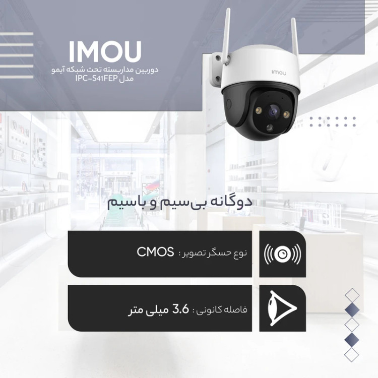 دوربین مداربسته تحت شبکه (IP) آیمو مدل IPC-S41FEP جزو سری دوربین های Cruiser آیمو می باشد.این دوربین مداربسته بی سیم اسپیددام دارای دید در شب تا برد 30 متر و رزولیشن تصویر 4 مگاپیکسل (4MP) می باشد.