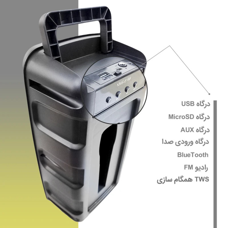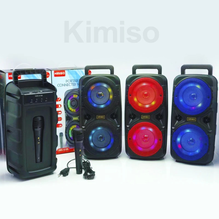 اسپیکر کیمیسو مدل KMS-6188 برای تولید صدای شفاف در محیط هایی که به صداهای مختلف نیاز است طراحی شده و به زبان ساده هر نوع صدایی که میتوان به صورت با کیفیت در محیط شنید را برای شما تولید میکند. اسپیکر بیسیم KMS-6188 از سری اسپیکرهای تولید شده توسط کمپانی کیمیسو است که به عنوان اسپیکر بی سیم روانه بازار شده است. این اسپیکر دارای قابلیت اتصال میکروفون است که با استفاده از این قابلیت میتوانید در میکروفون خود بخوانید و صدای خود را از این اسپیکر بشنوید. این اسپیکر بیسیم دارای باتری لیتیوم یونی قابل شارژ است. با استفاده از این باتریهای قابل شارژ میتوانید این اسپیکر را در هر زمان به هر مکان که مایل هستید به همراه خود ببرید و به موسیقیهای مورد علاقه خود گوش دهید. همچنین با هربار شارژ این اسپیکر نیز میتوانید تا ساعتها از پخش موسیقی لذت ببرید. اسپیکر KMS-6188 دارای ورودی میکروفون است. با استفاده از این ورودی میکروفون میتوانید میکروفون خود را به این دستگاه متصل کنید و با استفاده از قابلیت کارائوکه به صورت یک اجرای زنده صدای خود را از اسپیکر بشنوید. همچنین میتوانید یک موسیقی بیکلام پخش کنید و روی آن بخوانید. اتصال به این اسپیکر به دو صورت باسیم و بیسیم امکانپذیر میباشد. اتصال بیسیم از طریق بلوتوث و اتصال باسیم از طریق AUX، USB، Line و Micro SD Card صورت میگیرد. بنابراین با هرکدام از روشهای اتصال، میتوانید به این اسپیکر متصل شوید و موسیقیهای مورد علاقه خود را پخش کنید. بر روی قسمت بالایی این اسپیکر، تعدادی دکمه و کنترلکنندههای چرخشی قرار گرفته است. با استفاده از این پنل کنترلکننده، میتوانید به کنترل مقدار صدا و همچنین میتوانید با استفاده از دکمههای تعبیه شده بر روی این پنل، پخش موسیقیهای خود را نیز در کنترل خود قرار دهید. در قسمت بالایی پنل کنترلکنندهی این اسپیکر، یک صفحه نمایش دیجیتال قرار گرفته است.