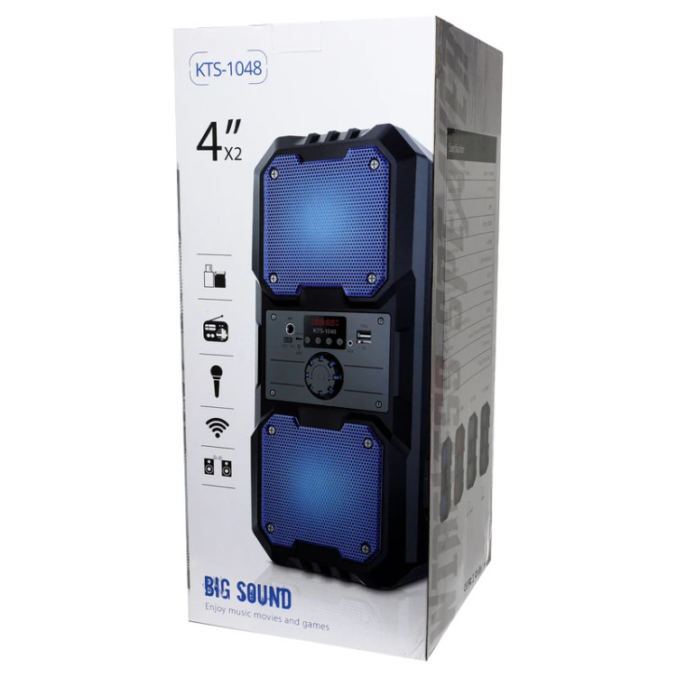 اسپیکر بلوتوثی قابل حمل مدل KTS-1048، محصولی از برند کی تی اس است. این اسپیکر دارای ابعاد نسبتا بزرگی است و با توجه به وزن مناسب، شما را قادر میسازد که به راحتی از آن در تفریحات، مراسمات و مهمانیها استفاده کنید و لذت ببرید. این اسپیکر دارای دو عدد باند 4 اینچی با توان 5 وات است که با توجه به حجم صدای قابل قبول و ورودی میکروفون، شما را قادر میسازد تا به عنوان بلندگو نیز از این اسپیکر استفاده کنید. ورودیهای AUX، فلش و مموری کارت و علی الخصوص اتصال از طریق بلوتوث، شما را در پخش موسیقی از هر وسیله دلخواه یاری کرده تا در هر جا و مکان، امکان پخش موسیقی را داشته باشید و لذت ببرید. روی بدنه KTS-1048، شاهد صفحه نمایش به همراه دکمههای کنترل صدا و پخش موسیقی هستید که با نگاه کردن به نمایشگر، میتوانید از وضعیت اتصال و پخش آهنگ مطلع شوید و آن را با دکمههای طراحی شده کنترل کنید. به علاوه، یک ریموت کنترل نیز به همراه محصول ارائه میشود که به شما امکان میدهد کارهای موردنظر خود را از راه دور و به راحتی انجام دهید. باتری داخلی و قابل شارژ 1200 میلیآمپری که درون دستگاه قرار دارد، آن را قادر میسازد تا بیشتر از 2 ساعت مداوم برای شما به پخش موسیقی بپردازد که این زمان با توجه به میزان مصرف شارژ اسپیکرهای بزرگ، بسیار قابل قبول است. این محصول در ابعادی به اندازه 160×160×400 میلیمتر و وزنی معادل 1950 گرم تولید شده است و در هنگام پخش آهنگ از نورپردازی خاصی استفاده میکند که موجب زیبایی دوچندان آن میشود. در مجموع قیمت بهصرفه، جنس بدنه مقاوم و صدای رسای این اسپیکر آن را به یکی از بهترین گزینهها برای شما تبدیل میکند که میتوانید از آن در مهمانیها و محافل مختلف بهره ببرید.