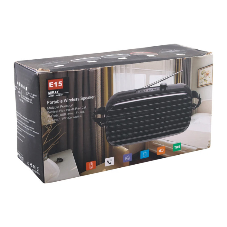 اسپیکر بلوتوث E15 بلندگویی قابل حمل است. این اسپیکر از طریق فناوری بی سیم بلوتوث به تلفن همراه یا سایر پخش کننده متصل شده و به پخش موزیک می پردازد. اسپیکر E15 از یک باتری داخلی قابل شارژ بهره برده است. برای شارژ این محصول باید با استفاده از کابل موجود در بسته بندی و با اتصال آن به برق و اسپیکر، آن را شارژ نمایید. وزن کم و ابعاد مناسب این اسپیکر بلوتوث باعث شده تا بتوانید به راحتی آن را حمل کنید و همیشه و در همه جا آن را به همراه داشته باشید.با اولین نگاه به اسپیکر E15، قطعا عاشق آن خواهید شد. بلندگویی بی سیم که در نمایی از رادیوهای قدیمی با سبکی نوستالوژی ساخته شده است. سیم آنتن، ولومی تنظیم موج رادیو و غیره همگی ما را به یاد خاطرات کودکی می اندازد.این اسپیکر علاوه بر اتصال از طریق بلوتوث به پخش کننده ها قادر است تا از طریق کابل 3.5 میلیمتری نیز به آن ها متصل شود. پس اگر کامپیوتر یا دستگاهی دارید که بلوتوث ندارد نیاز نیست نگران باشید چراکه با استفاده از این کابل می توانید از اسپیکر استفاده کنید. روش دیگر اتصال به اسپیکر، قرار دادن کارت حافظه درون اسپیکر و پلی کردن موزیکها از روی آن است. همچنین در صورتی که آهنگهای مورد علاقه تان را روی فلش مموری ذخیره کرده اید، تنها با اتصال فلش مموری به اسپیکر می توانید از شنیدن آهنگهای خود لذت ببرید. اسپیکر پرتابل E15 با وزن کم، بلندگوی ایده آل برای استفاده در مسافرت و بیرون از منزل است زیرا این اسپیکر ابعادی جمع و جور داردو حمل آن نیز آسان است. به راحتی می توانید آن راهمیشه همراه داشته باشید.