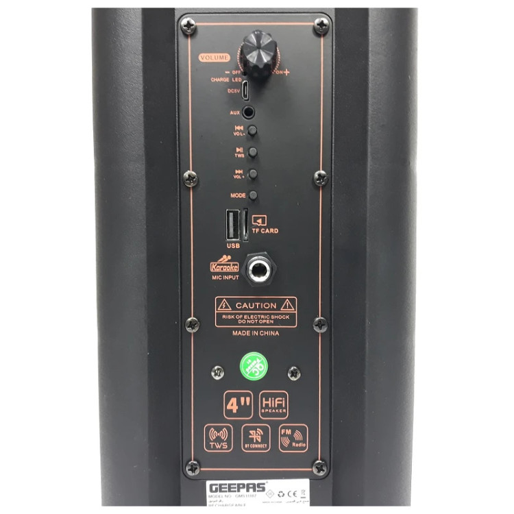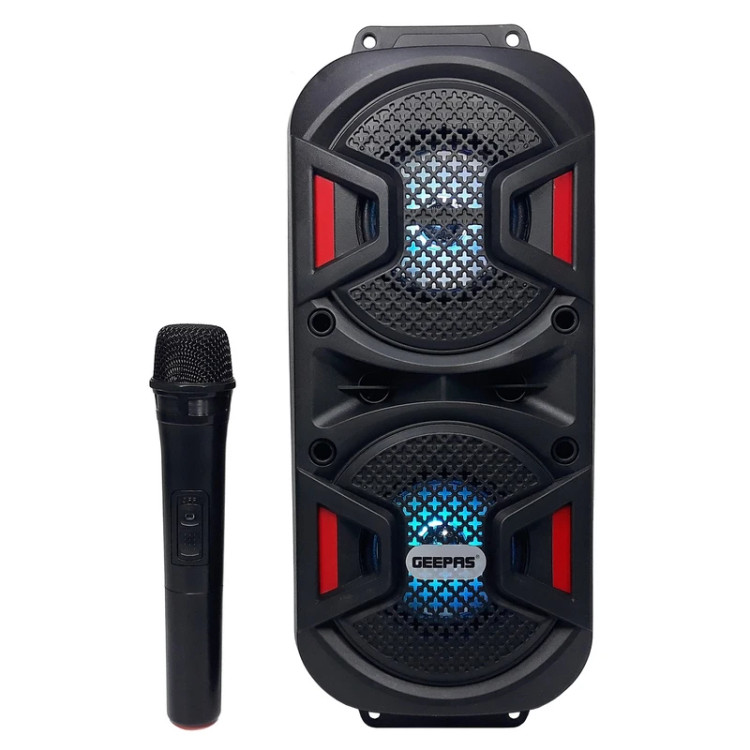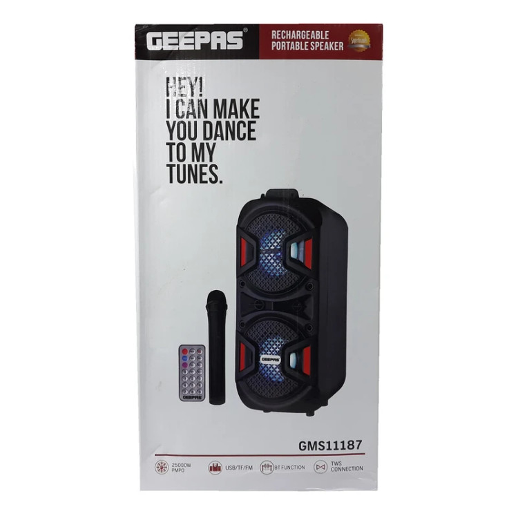 شرکت جی پاس با بیش از 38 سال سابقه در زمینه عرضه لوازم خانگی و صوتی و تصویری و ... در قاره های های آسیا ، اروپا و آمریکا با ارائه بیش از 1500 دستگاه ، فعالیت گسترده دارد. مجموعه کامل اسپیکر دارای اکو و میکروفون بی سیم با امکان پخش صدای زنده با اکو و همچنین پخش موسیقی و فایل های صوتی با مدل GMS11187 یکی از این محصولات است .دستگاه صدای باس ( یا بیس ) مناسبی دارد . دستگاه را می توان با میکروفون با سیم با کیفیت صدای بسیار عالی که به همراه دستگاه ارائه می شود ،جهت اجرای زنده برنامه های صوتی و مراسم، استفاده کرد. دستگاه امکان پخش صدای استریو را دارد و علاوه بر آنکه از طریق کارت حافظه و فلش مموری فایل های استریو را پخش می کند - دو بلند گو در دستگاه نصب شده اند - با سیستم TWS که اتصال بی سیم بلوتوثی استریو یا True Wireless Stereo می باشد ، از طریق بلوتوث صدای استریوی موبایل و یا هر پخش کننده بلوتوثی را می تواند پخش کند . داخل حفره قرار گیری بلندگوی دستگاه ، رقص نور تعبیه شده است .تغذیه دستگاه را یک باتری 3.7 ولت 1500 میلی آمپر ساعت لیتیوم یون بر عهده دارد که با شارژ 5 ولت موبایل شارز آن انجام می شود.دستگاه قابلیت اتصال میکروفون باسیم را هم دارد .