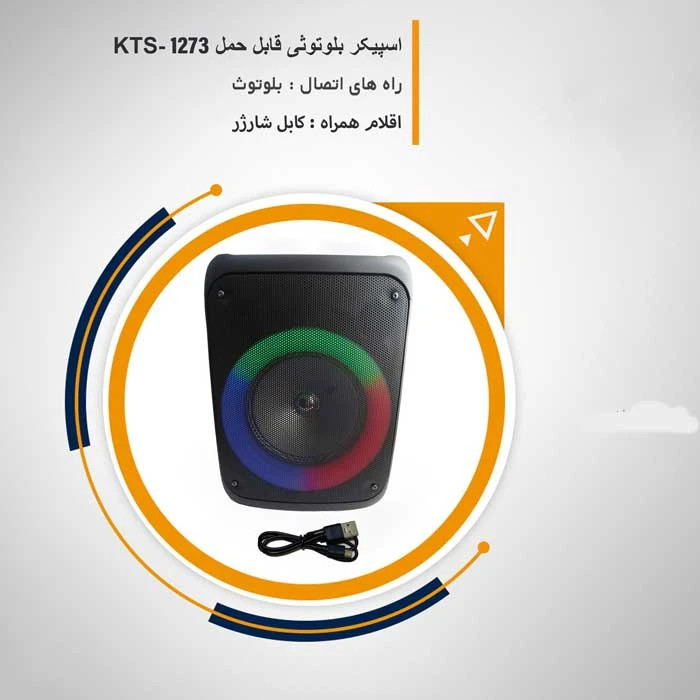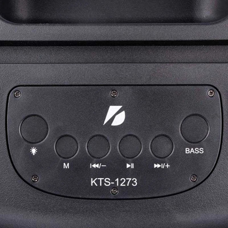 اسپیکر KTS-1273 یک اسپیکر شارژی و قایل حمل میباشد که تمامی امکانات را داراست از جمله فلش و مموری و بلوتوث و AUX و میکروفون . این اسپیکر دارای یک عدد میدرنج 8 اینچی بوده که کیفیت صدای عالی ای به همراه بیس خوب و صدایی بسیار شفاف را به شما میدهد بدنه این دستگاه از جنس فایبر و جلوی دستگاه دارای توری فلزی میباشد که هم در خروجی صدا و هم در مقاوت بر اثر ضربه کیفیت بالاتری نسبت به سایر مدل ها به شما میدهد