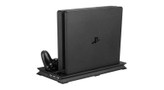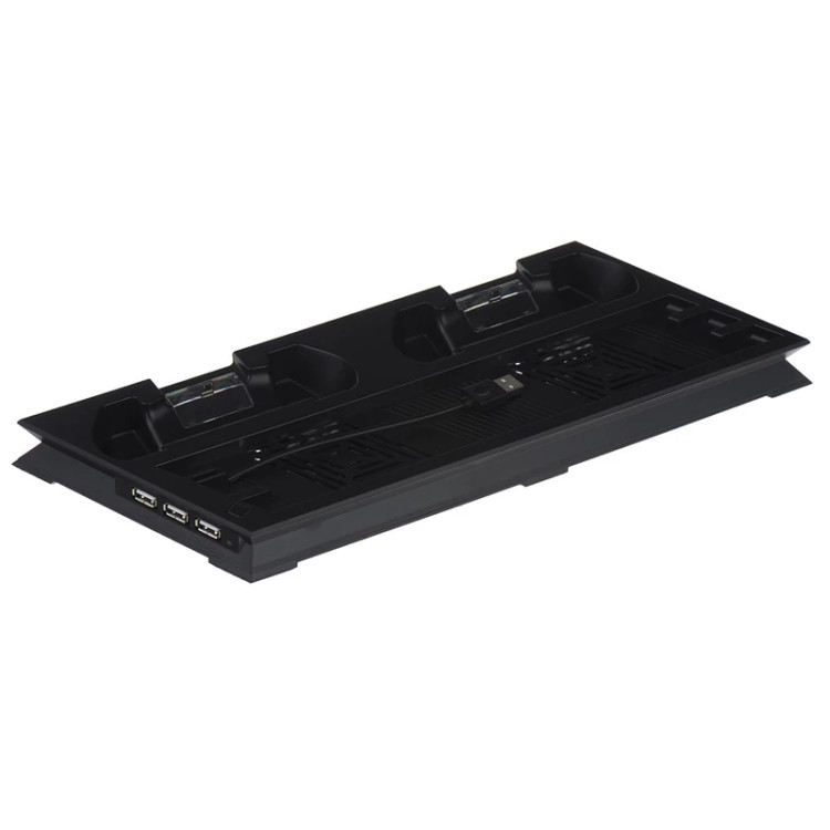 پایه نگهدارنده پلی استیشن 4 اسلیم مدل «Ultrathin Charging Heat Sink» وسیلهای چندکاره است که برای دارندگان PlayStation 4 Slim بسیار کارآمد واقع میشود. با استفاده از این پایه کنسول بازی به صورت عمودی روی زمین قرار گرفته و فنهایی که داخل این پایه قرار گرفتهاند آن را خنک میکنند. این امر باعث میشود که دمای کنسول در حد استاندارد باقی مانده و از آسیبدیدنش جلوگیری شود. دو محفظهی مخصوص برای قراردادن دستههای DualShock 4 کنار پایه تعبیه شده است تا بتوانید از این طریق دستههای بازی خود را شارژ کنید. این محصول از طریق کابل USB کوتاهی که به آن متصل شده است، منبعتغذیهی خود را از کنسول دریافت میکند. روی بدنه سه عدد پورت USB قرار گرفته است که راه دیگری برای شارژ دستهها به حساب میآید. درواقع میتوانید با تهیهی کابلهای جداگانه، سه دستهی بازی را به صورت همزمان شارژ کنید. فنها حین کارکردن صدای خاصی تولید نمیکنند. درنتیجه هنگام استفاده از این دستگاه برای کاربر مزاحمتی ایجاد نمیشود. استفاده از این محصول باعث میشود که بازی با کنسول با راحتی بیشتری انجام شود و گیمر از بازی با کنسول خود لذت بیشتری میبرد.