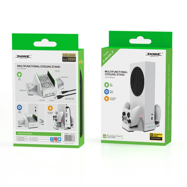 با استفاده از پایه چندکاره Dobe مخصوص ایکس باکس سری اس، شما میتوانید کنسول ایکس باکس سری اس را به صورت عمودی قرار داده و با استفاده از فنهای سریع و بیصدای این پایه، آن را خنک کنید. همچنین، این پایه دارای دو محل نگهداری و شارژ دسته ایکس باکس به همراه دو عدد باتری قابل شارژ برای ایکس باکس سری اس و دو عدد باتری قابل شارژ برای ایکس باکس وان است. این پایه دارای یک دکمه برای روشن و خاموش کردن فن، یک پورت USB برای شارژ و یک پورت USB برای اتصال لوازم جانبی به کنسول است.