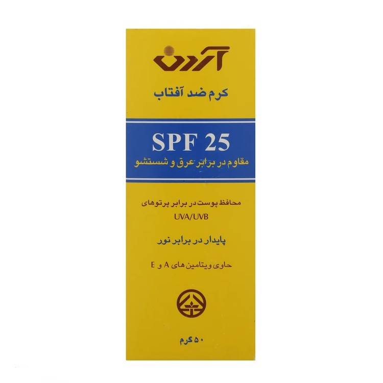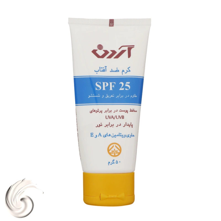 کرم ضدآفتاب بیرنگ آردن با SPF25، حاوی محافظ UVA ،UVB و ضدآب، حاوی ویتامینهای E و A، مناسب انواع پوست
