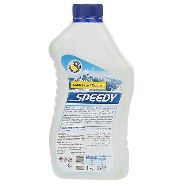 ضدیخ خودروی «اسپیدی» (Speedy)با وزن 1 کیلوگرم به بازار عرضه شده است. این محصول را باید با نسبت 50 درصد با آب مخلوط کنید تا برای استفاده آماده شود. با اضافهکردن این محصول به سیستم خنککنندهی خودرو، بهسادگی از یخزدگی آب موجود در سیستم خودروی خود جلوگیری کنید. این محصول قادر است هم دمای نقطهی انجماد آب را پایین بیاورد و هم دمای نقطهی جوش آن را بالا ببرد؛ به این ترتیب هم از یخزدن آب و هم از جوشآمدن آن جلوگیری میکند. این محصول بر پایهی اتیلن گلیکول و مواد افزودنی مناسب جهت مصرف در سیستم خنککنندهی خودروهای بنزینی و دیزلی ساخته شده است. از ویژگیهای منحصربهفرد این محصول سازگاری کامل آن با قطعات لاستیکی و تمامی واشرهاست که باعث میشود در اثر استفاده از محصول و بهمرور زمان، مشکلی برای قطعات داخلی سیستم خنککننده بهوجود نیاید. در تهیهی ضدیخ از موادی استفاده شده است که قادرند از سیستم خنککاری و تمامی قطعات موجود در آن دربرابر زنگزدگی و خردگی محافظت کنند.