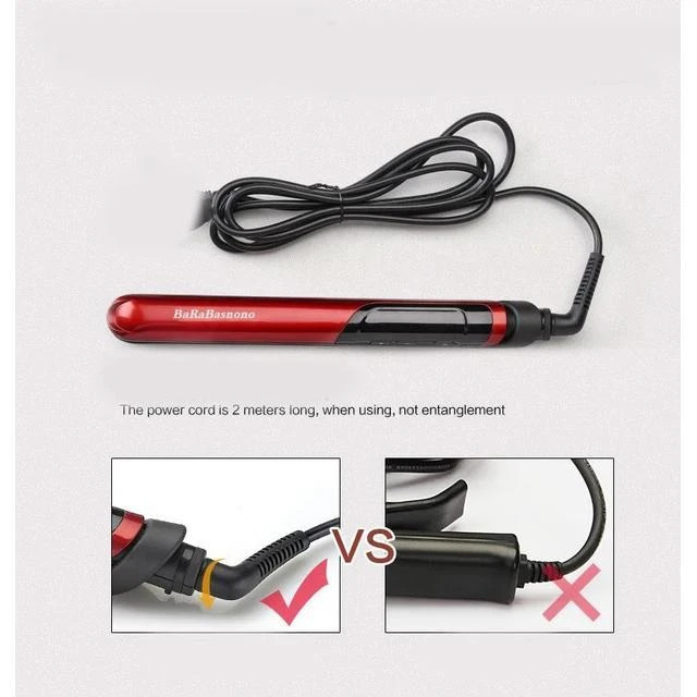 اتو مو باراباس نانو مدل 3300، با صفحات متوسط از جنس سرامیک، دارای سیم گردان، لبههای گرد، جلوگیری از آسیبدیدن موها، گستره دما 100 تا 230 درجه سانتیگراد، به همراه سیم 1.9 متری