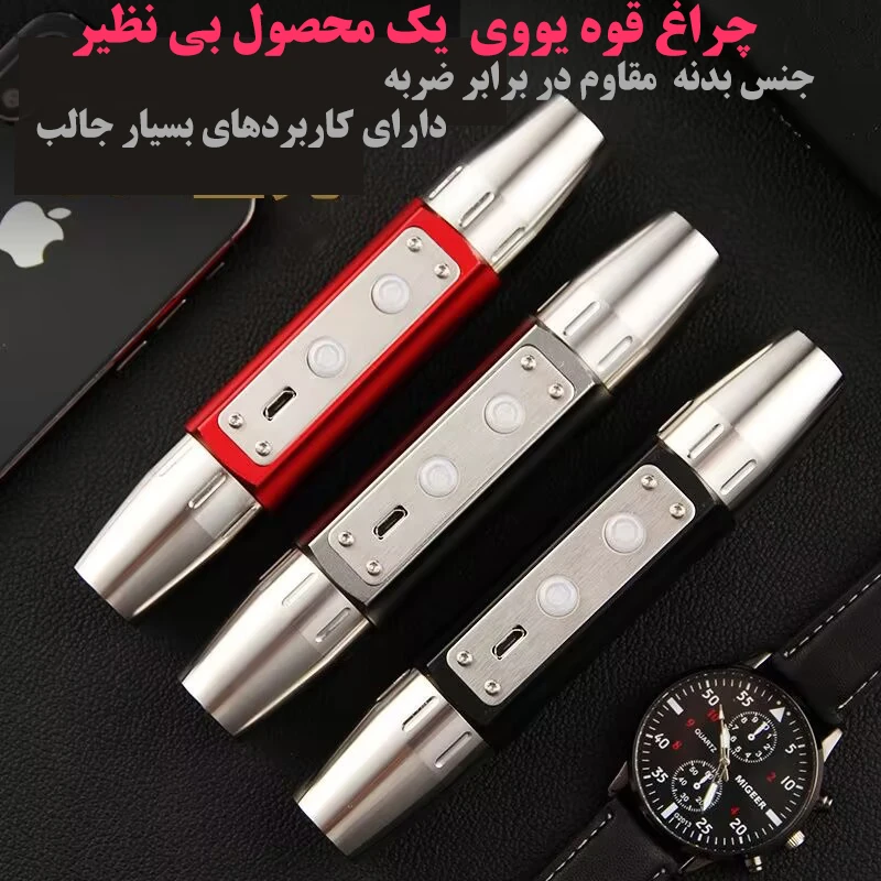 مشاهده محصولات مرتبطچراغ قوه UV یک محصول بی نظی که دارای کاربردهای بسیار جالب است. این چراغ قوه دارای جنس بدنه آلیاژ آلومینیوم، و مقاوم در برابر ضربه می باشد. چراغ قوه از 4 لامپ تشکیل شده است و این چهار لامپ با دو عدد دکمه پاور قابل روشن و خاموش شدن می باشد. یک قسمت از چراغ قوه دارای دو لامپ به رنگ های سفید و زرد می باشد که هرکدام دارای دو حالت نوردهی قوی و ضعیف است و قسمت دیگر چراغ قوه دارای لامپ یووی می باشد که کاربردهایی چون: تشخیص اسکناس تقلبی، پیداکردن حشرات و جانوران موزی مثل عقرب و… می باشد. منبع تغذیه این چراغ قوه یووی توسط کابل یو اس بی صورت می گیرد