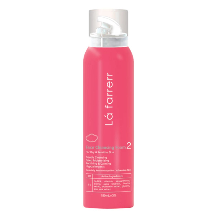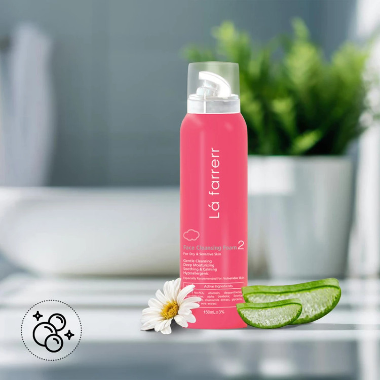 فوم شستوشوی صورت لافارر، مناسب پوستهای خشک و حساس، پاککننده ملایم، آبرسان عمیق، التیامبخش، روشنکننده، ضدحساسیت، ترکیبات آلانتوئین، بیولین، عصاره بابونه، عصاره آلوئه ورا، سدیم PCA، دکسپانتنول، گلیسیرین، آلفابیزابولول، حجم 150 میلیلیتر