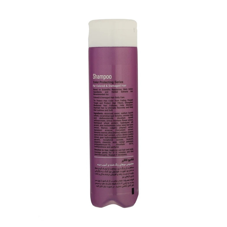 شامپو تثبیت کننده رنگ، درخشان کننده و تقویت کننده مو لافارر ، سازگار با موهای رنگ شده و آسیبدیده، حاوی پروتئین هیدرولیز شده گندم و عصارههای دم اسب، آلوئه ورا، گزنه، سدر، حنا، آویشن، با حجم 250 میلیلیتر مدل Boost Series