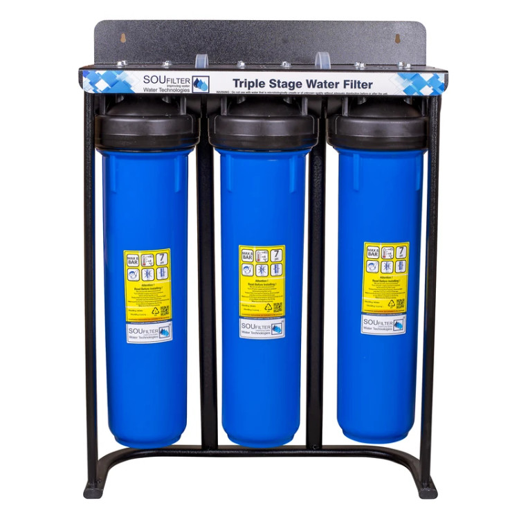پیش تصفیه سه مرحله جامبو سوفیلتر به عنوان پیش تصفیه آب در مسیر لوله آب قرار می گیرد و با استفاده از فیلتر الیافی درون آن گل و لای، شن و ماسه و ذرات معلق را تا 5 میکرون تصفیه می کند. این محصول به عنوان پیش تصفیه آب ساختمان، ویلا، کارگاه و هر جایی که نیاز به تصفیه ذرات معلق آب ورودی باشد به کار میرود. ارتفاع فیلتر درون این محصول 20 اینچ و پورت ورودی و خروجی آن از جنس پلاستیک و 1 اینچ (لوله 3) می باشد .