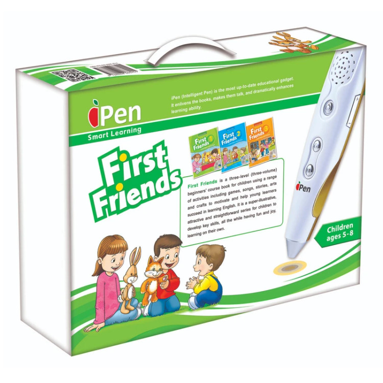 بسته هوشمند آموزش زبان انگلیسی First Friends شامل 3 جلد کتاب اصلی هوشمند American First Friends و 6 جلد کتاب مکمل هوشمند Alphabet & Songs, Spelling & Songs, Writing & Songs برای این مجموعه است. همچنین در این بسته بندی جذاب یک عدد قلم کتابخوان iPen قرار داده شده است که استفاده از محتوای صوتی این کتاب ها را فراهم کرده است. قلم هوشمند iPen به عنوان یک فناوری نوین، انقلابی در آموزش زبان محسوب میگردد. این قلم الکترونیکی به همراه کتابهای هوشمند، یادگیری زبان دوم را تسهیل مینماید. با قرار دادن iPen روی صفحههای این کتابها، دنیای جدیدی به روی فراگیران باز شده و اشتیاق یادگیری و اعتماد به نفس را در آنها به میزان چشمگیری افزایش میدهد. با این ابزار آموزشی مهارتهای درون فردی (Intrapersonal) و بین فردی (Interpersonal) در زبانآموزان نهادینه شده و آیندهی روشنتری پیش روی آنها قرار خواهد گرفت. از آنجایی که تمامی حروف، کلمات، جملات و تصاویر هر کتاب توسط متخصصین و گویندگان حرفه ای صداگذاری شدهاند، فراگیران می توانند با قرار دادن قلم بر روی صفحات کتاب ها، محتوای صوتی آن ها را شنیده و نسبت به یادگیری زبان انگلیسی مشتاق شوند. از محتویات دیگر این بسته آموزشی می توان به CD های چند رسانه ای، هندزفری، شارژر، کیف پارچه ای و گردن آویز قلم اشاره نمود.
