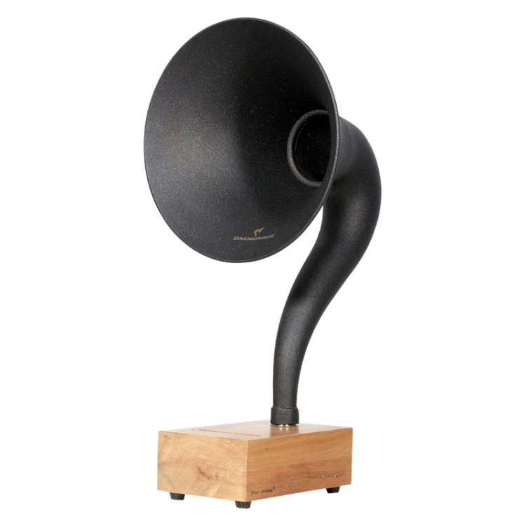هدیه ای متفاوت و ماندگار که نمونه اش را جایی ندیده اید. هدیه ای برای کسانی که بسیار عزیز هستند و دوستشان دارید. این هدیه درامافون نام دارد. درامافون در واقع یک گرامافون مدرن است! همان گرامافونی که خاطرات بسیاری از گذشته های شیرین در ذهنمان رقم زده است و حس خوب و نوستالژیک خانه قدیمی پدربزرگ و مادربزرگ را دوباره برایمان زنده می کند. با الهام از اصالت گذشته و روزگار مدرن امروز ساخته شده و ترکیبی هنرمندانه از سنت و صنعت ایرانی است. یک شیپور با قوس و قزحی نرم و لطیف که با رنگی سیاه و مات پوشش داده شده و هویتی اصیل به آن بخشیده و روی دهانه لاله شکلش نام درامافون با رنگ طلایی زینت داده شده است. شیپور با یک میله طلایی روی پایه ای چوبین از جنس راش سرخ سوار می شود که نقش و نگار سرشت چوب، زیبایی دوچندان به آن بخشیده است. در جلو و روی پایه نیز شیاری هست که گوشی موبایل داخل آن قرار میگیرد تا صدای موسیقی از آن پخش گردد. طراحی ظاهری مینیمال، مدرن و زیبا، درامافون را برای هر چیدمان و دکوراسیونی نیز مناسب ساخته است. همانطور که گفته شد درامافون یک گرامافون مدرن است اما با این تفاوت که درامافون با موبایل کار می کند و بدون نیاز به تکنولوژی خاصی! بدون نیاز به برق، باتری، شارژر و بلوتوث و تنها با کمک بلندگوی گوشی. کافیست گوشی موبایل خود را داخل شیار روی پایه چوبی قرار دهید و موسیقی و موزیک خود را پلی کنید و از شنیدن صدای اصیل و نوستالژی درامافون که از شیپور آن پخش می شود متعجب شوید و لذت ببرید. طراحی درامافون به گونه ای است که صدا اصالت خود را حفظ کرده و با استفاده از آزمایش ها و بررسی های مختلف نزدیکترین حالت را به صدای گرامافون های قدیمی دارد. لازم بذکر است که درامافون برای همه گوشی ها کاربرد ندارد. این محصول گوشی ها و موبایل هایی را پشتیبانی می کند که اسپیکر یا بلندگوی آنها در پایین بدنه و سمت راست قرار گرفته اند.