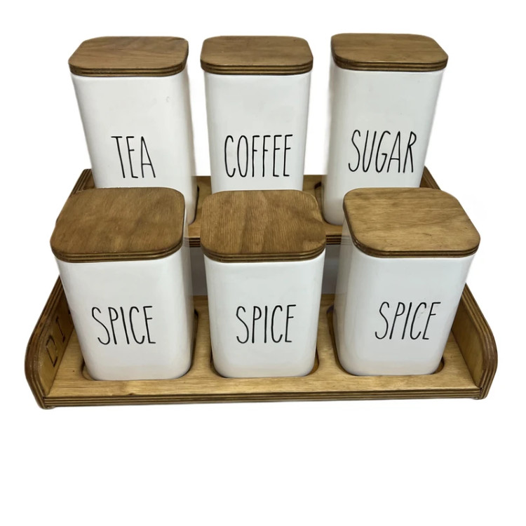 این ست جا ادویه تشکیل شده است از 6 عدد بانکه با قطر 9 سانتیمتر که 3 عدد آن به ارتفاع 15 سانتیمتر و 3 عدد آن به ارتفاع 12 سانتیمتر که دارای یک استند و دربهای چوبی از جنس پلی وود ضد آب با طراحی منحضر به فرد که هر بانکه در جایگاه خود قرار می گیرد
