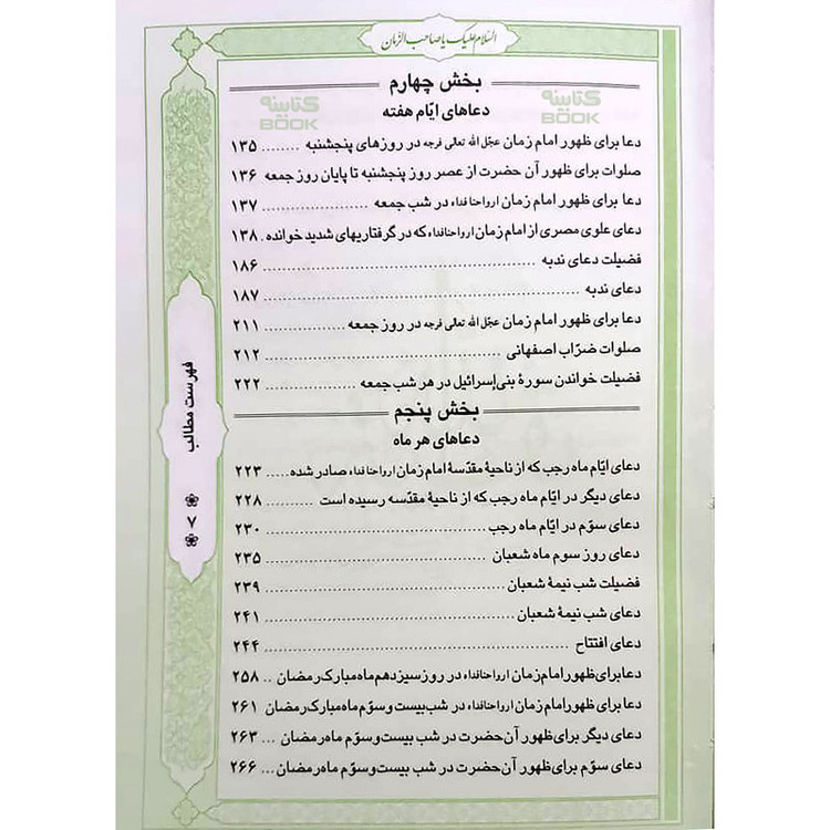 منتخب صحیفه مهدیه مقدمه کتاب مذهبی منتخب صحیفه مهدیه شامل مطالب علمی، اخلاقی، تاریخی، و روایی پیرامون مسائلی مهم چون: تشویق دعا از نظر عقل و نقل، آداب دعا، شرایط، موجبات استجابت، دعا برای ظهور حجت بن الحسن ارواحنا فداه، تشکیل مجالس دعا برای وی، نصایح و تجارب بزرگان پیرامون دعا، انتظار و…. دیگر مواردی هم چون حجت بن الحسن در کلمات اهل بیت علیهم السلام می باشد. بخش اول: نمازهابخش دوم: دعاهای قنوتبخش سوم: ادعیه بعد از نمازهابخش چهارم: دعاهای ایام هفتهبخش پنجم: دعاهای هر ماهبخش ششم: در بخش ششم کتاب منتخب صحیفه مهدیه دعاهایی که مخصوص روز معینی از ایام هفته نیستبخش هفتم: توسل به حجت بن الحسنبخش هشتم: عریضه هابخش نهم: استخاره هابخش دهم: دعاهایی که حجت بن الحسن از پدرانش نقل کرده استبخش یازدهم: زیارت هابخش دوازدهم: زیارات نواب حجت بن الحسن و بعضی از دعاهایی که اصحاب وی نقل کرده اند آمده است. در یکی از دعاهای کتاب منتخب صحیفه مهدیه آمده است : “اَدرِک بِنا أَتِامَهُ و ظُهُرَهُ وَ قِیامَهُ وَجعَلنا مِن اَنصارِهِ وَاقدِن ثارَنا بِثارِهِ وَکتُبنا فی اَعوانِهِ وَ خُلَصائِهِ وَ أَحنِیا فی دَولَتِهِ ناعِمینَ وَ بِصُحبَهِ غانِمینَ وَبِحَقِّحِه قاعِمینَ وَ مِنَ سُّوء سالِمینَ یا اَرحَمَ الرّاحَمین.”“ما را موفق به درک روزگار و آشکار شدنش و قیامتش بگردان و ما را از یاران آن حضرت قرار بده و خونخواهی ما را به خونخواهی او پیوسته گردان و ما را در گروه یاران و مخلصان بی آلایش ایشان بنویس و ما را در دولت آن حضرت ، برخوردار از نعمت زنده بدار و به همراهی او بهره مند و به ادای حقش پا برجا و از بدی نیز برکنار بدار ای مهربانترین مهربانان.” کتاب “صحیفه مهدیه” نوشته سیّد مرتضی مجتهدی و ترجمه محمّدحسین رحیمیان، علاوه بر مقدمه و خاتمه دارای 12 باب است با اضافاتی که پس از ویرایش اول به آن افزوده شده است دارای بیش از 450 نماز دعا، زیارات و… است. خاتمه ی کتاب شامل عبارت ها و زیارت های خاصّی است که مورد توجّه و عنایت آن حضرت است مثل نماز شب، زیارت عاشورا، زیارت جامعه ی کبیره، زیارت امین الله. جهت دریافت اطلاعات بیشتر در مورد شناسنامهکتاب منتخب صحیفه مهدیه اینجا را کلیک کنید.
