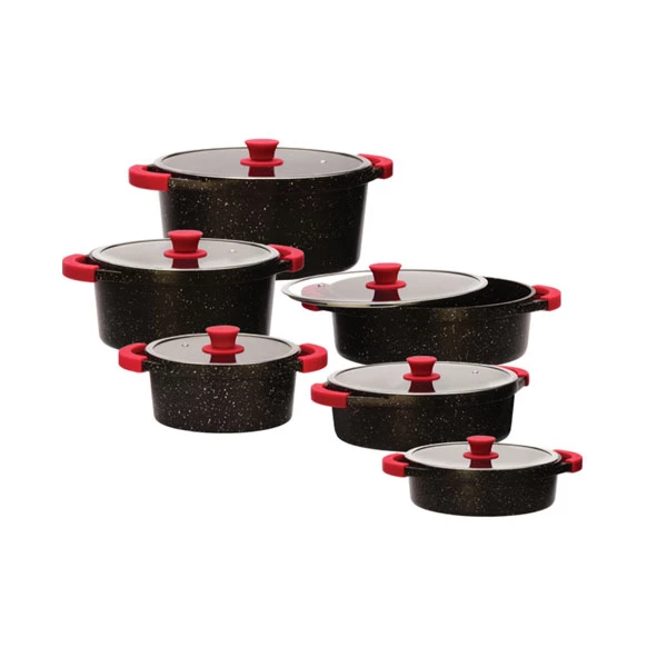 سرویس قابلمه و تابه 12 پارچه زرساب، جنس بدنه آلومینیوم با روکش داخلی گرانیت، طراحی مناسب جهت پخش بهتر گرما، مدل مونارک، سایز قابلمهها 20، 24، 28، سایز تابه دو دسته 20، 24، 28