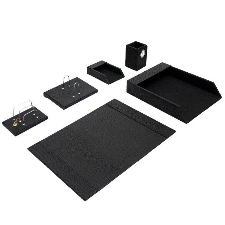 ست رومیزی لوازم اداری چرمی پوست ماری شامل زیر دستی، کازیه، جای کاغذ یادداشت، پایه تقویم، استند پاکت نامه، جاکارتی، استند روان نویس و جا قلمی لیوانی است. به همراه این ست یک ست خودکار و روان نویس هدیه ی ما به شماست.
