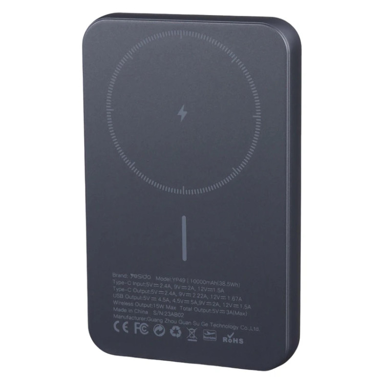 شارژر همراه یسیدو مدل YP49 با ظرفیت 10000 میلی آمپر ساعت ساخته کارخانه یسیدو است.این محصول دارای باتری داخلی با ظرفیت اسمی 10000 میلی آمپر ساعت، دارای یک عدد درگاه خروجی از نوع تایپ سی (مشترک)، یک عدد USB و یک عدد پد شارژ وایرلس است.پشتیبانی از شارژ سریع QC3.0 و فناوری Power Delivery، درگاه USB دارای حداکثر توان خروجی 22.5 وات و درگاه Type-C دارای حداکثر توان خروجی 20 وات است.بهره مندی از یک عدد درگاه ورودی Type-C (مشترک) و کابل تایپ سی به منظور شارژ کردن پاوربانک، دارای قابلیت استفاده در هواپیما است.دارای نمایشگر LED جهت نمایش شارژ باقیمانده، موفق به دریافت استانداردهای ایمنی و سلامت محصول نظیر CE/ FCC و RoHS است.توان خروجی پد وایرلس معادل با 5، 7.5، 10 و 15 وات، شدت جریان خروجی در صورت استفاده همزمان معادل 3 آمپر در 5 ولت است.بدنه خوش ساخت از جنس پلاستیک، امکان روشن و خاموش کردن پاوربانک توسط کلید فیزیکی روی بدنه است.